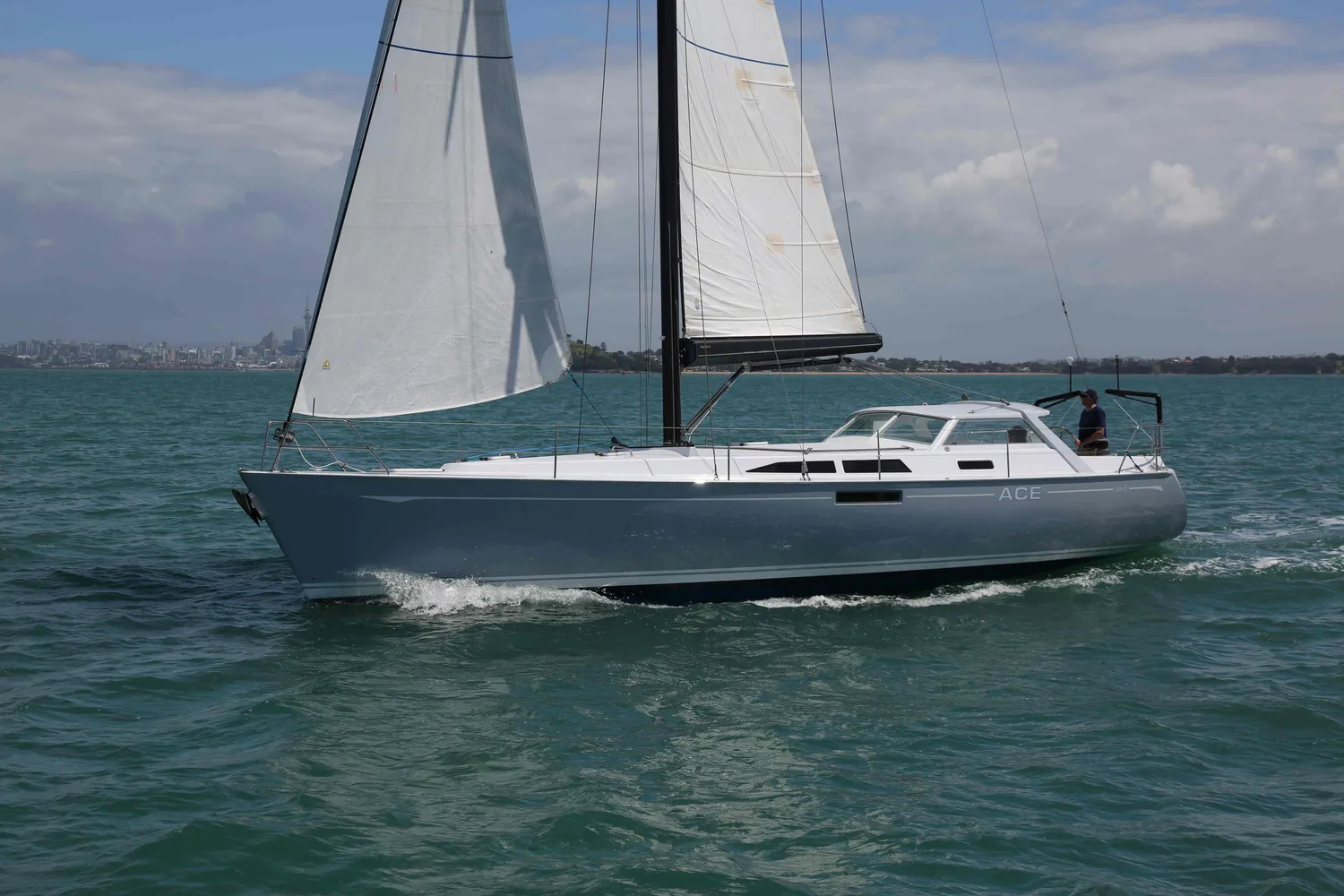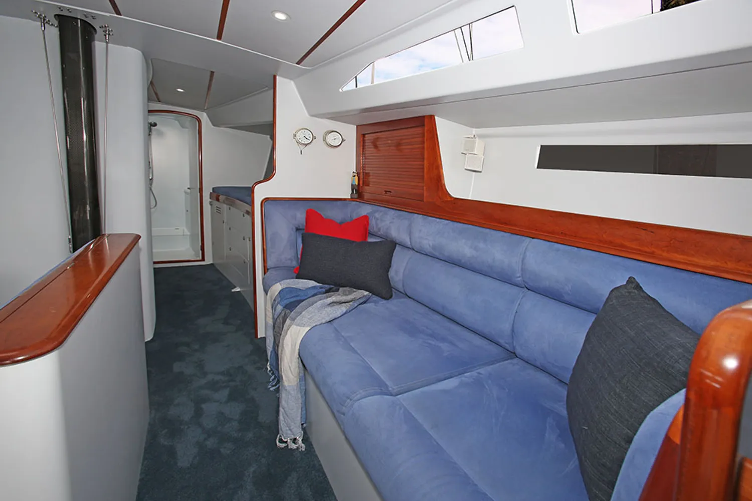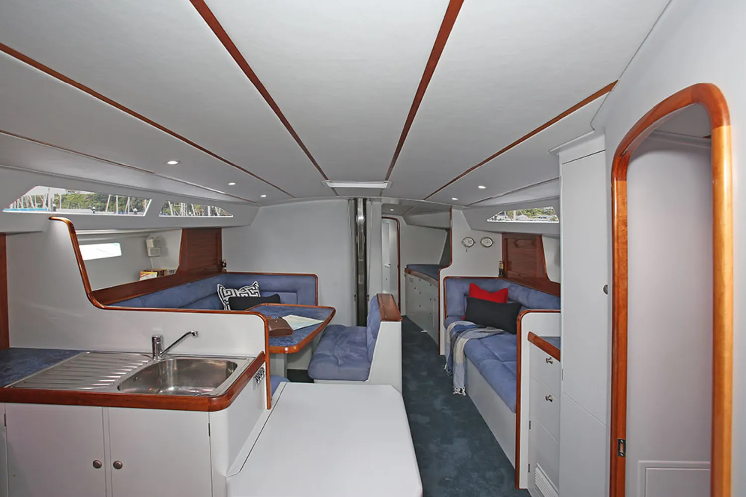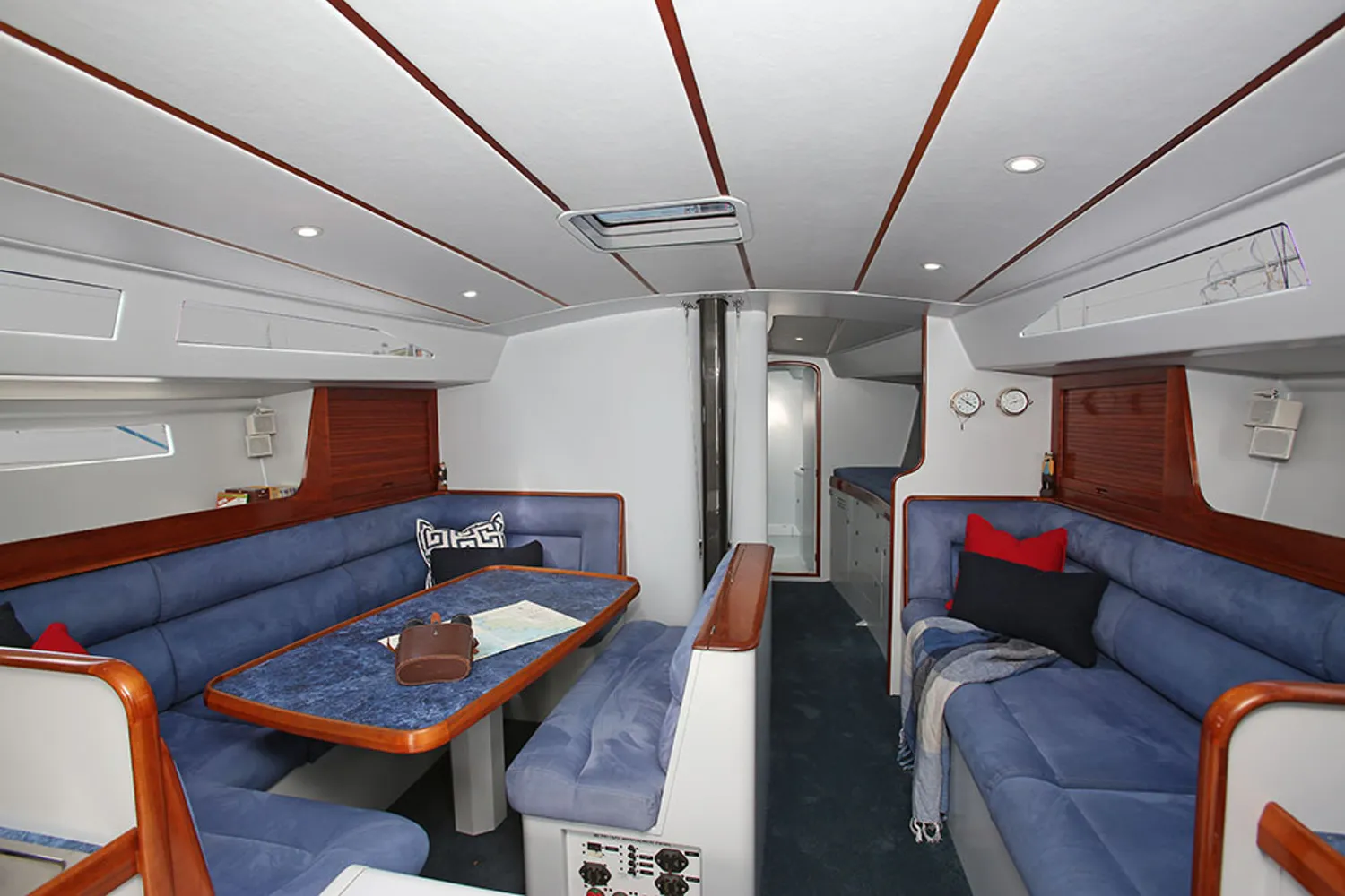 With a large interior volume for a 45-footer, Ace is an extremely comfortable and well-behaved cruising yacht. The hard dodger provides good shelter from the elements while the roller furling main and self-tacking jib make her a reasonably lightweight and well performed boat on and off the wind. She can be confidently sailed single-handed in relative comfort.