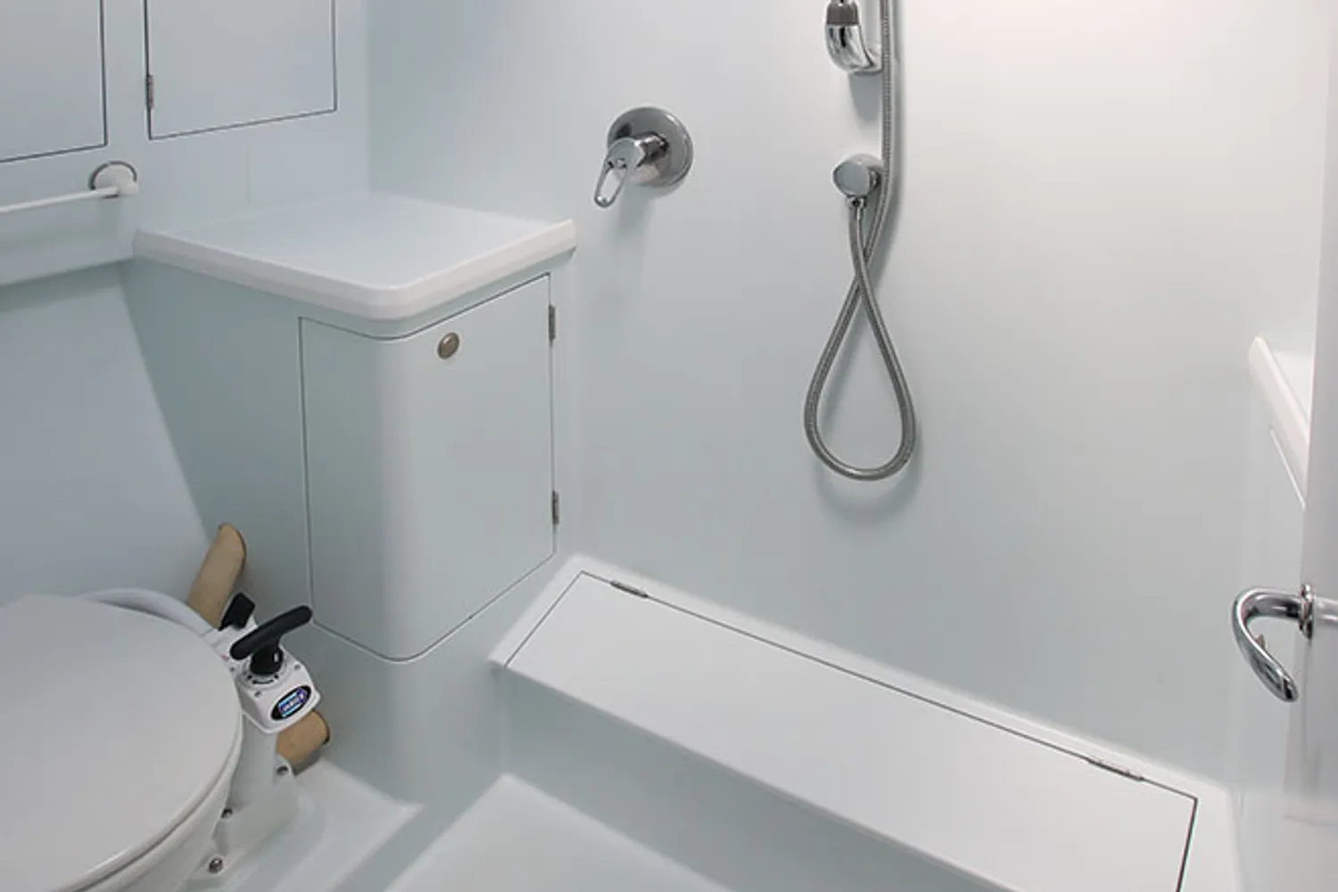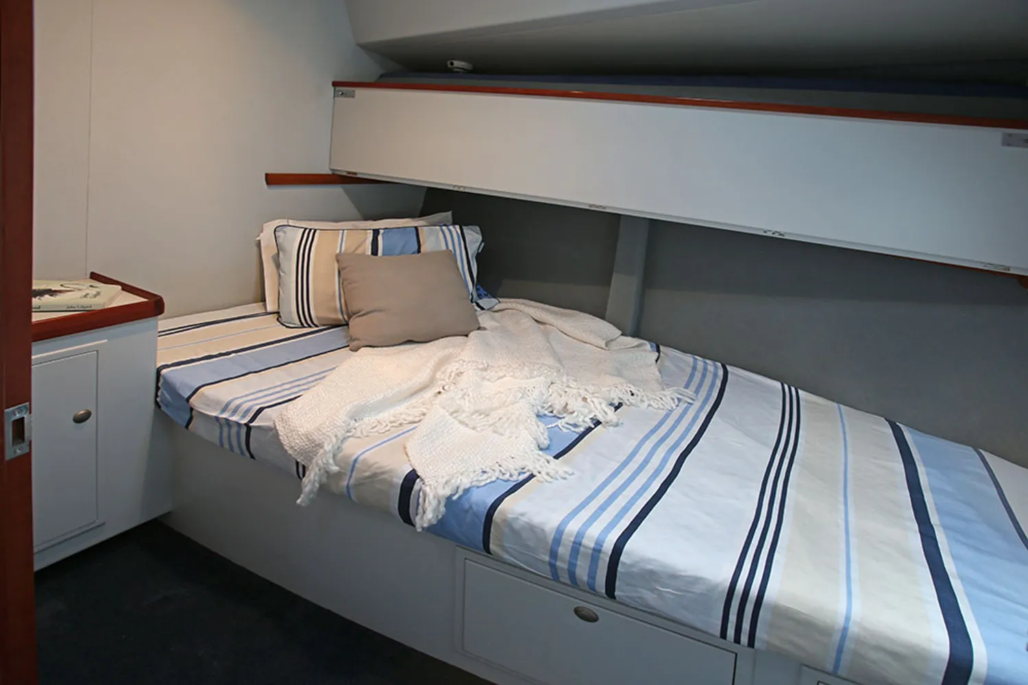 Featuring two large double cabins with two single bunks. There is seating for 10 adults in the main saloon. The head and shower are forward and of generous proportions. The galley has a full domestic fridge and freezer and a 3 burner gas cooker and oven.