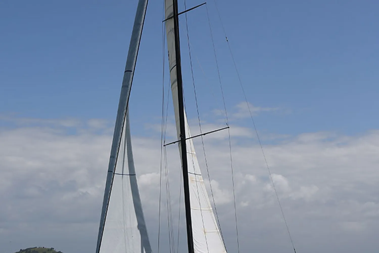 Ace is built in strip planked cedar core, with a carbon rig and Harken deck gear, including electric winches and full carbon rudder and dinghy davits.