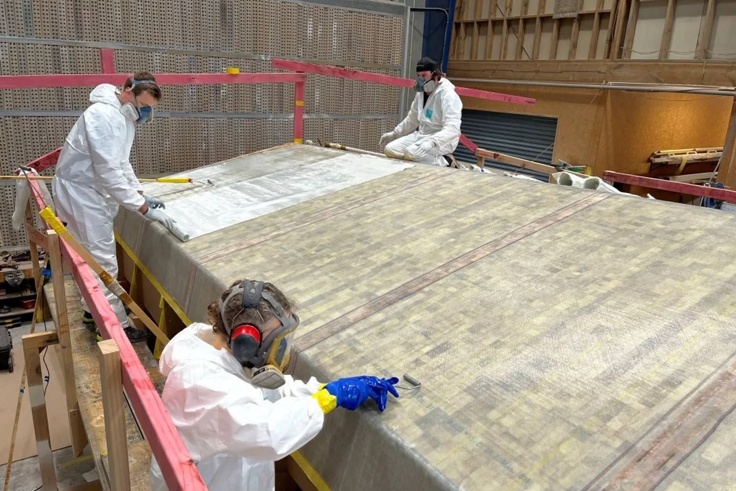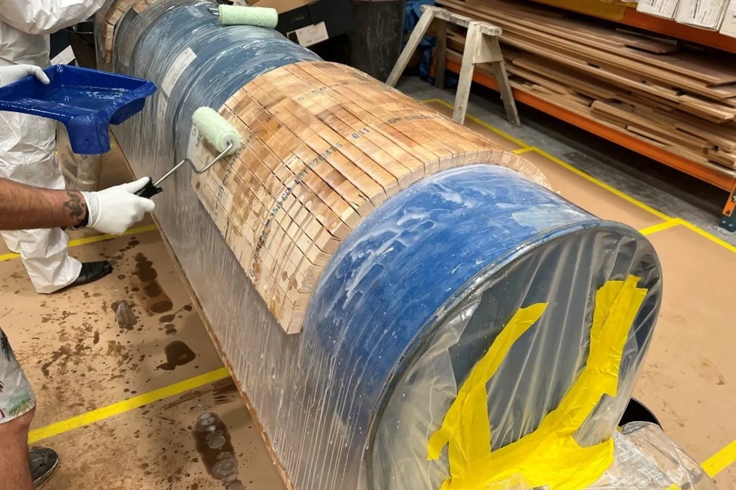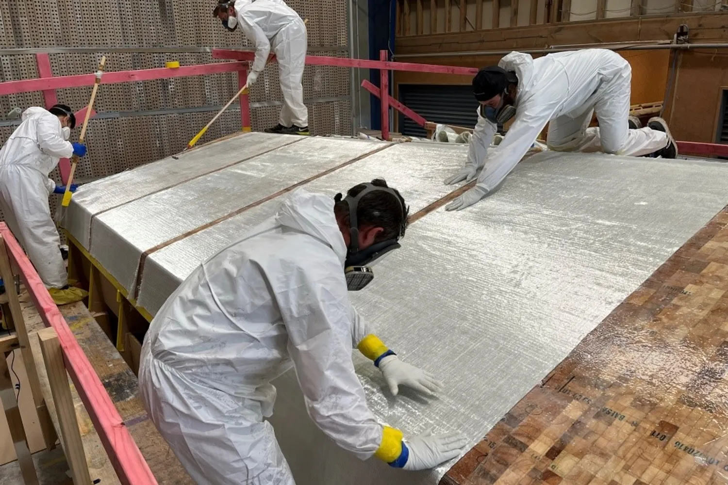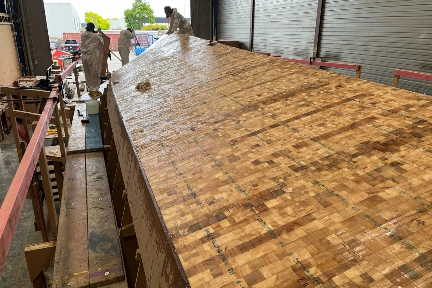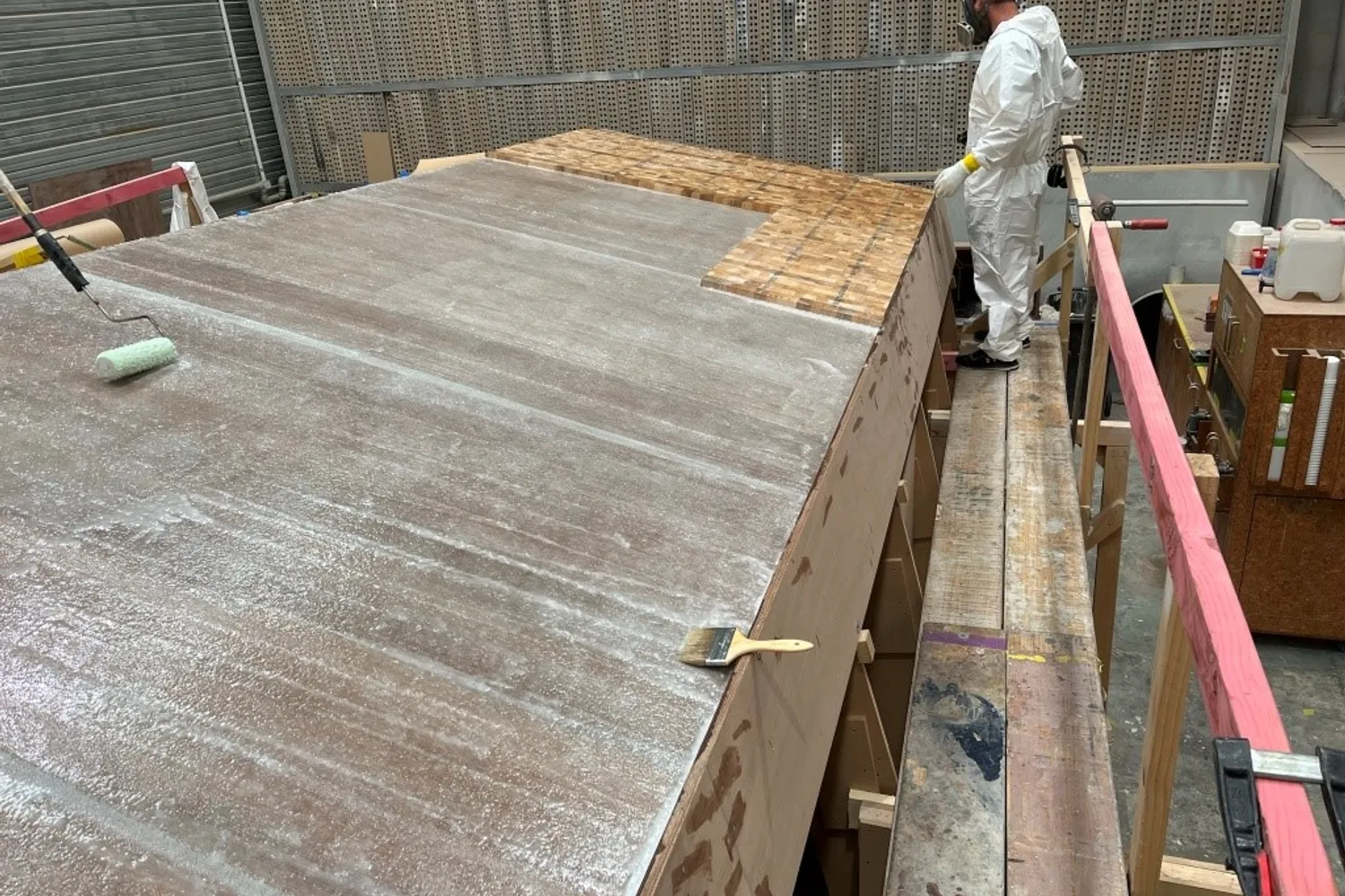 Fiberglass inside laminate laid over the plywood. The pre-epoxied, end grain Balsa core is then placed on top - of the still wet - Fiberglass bond layer